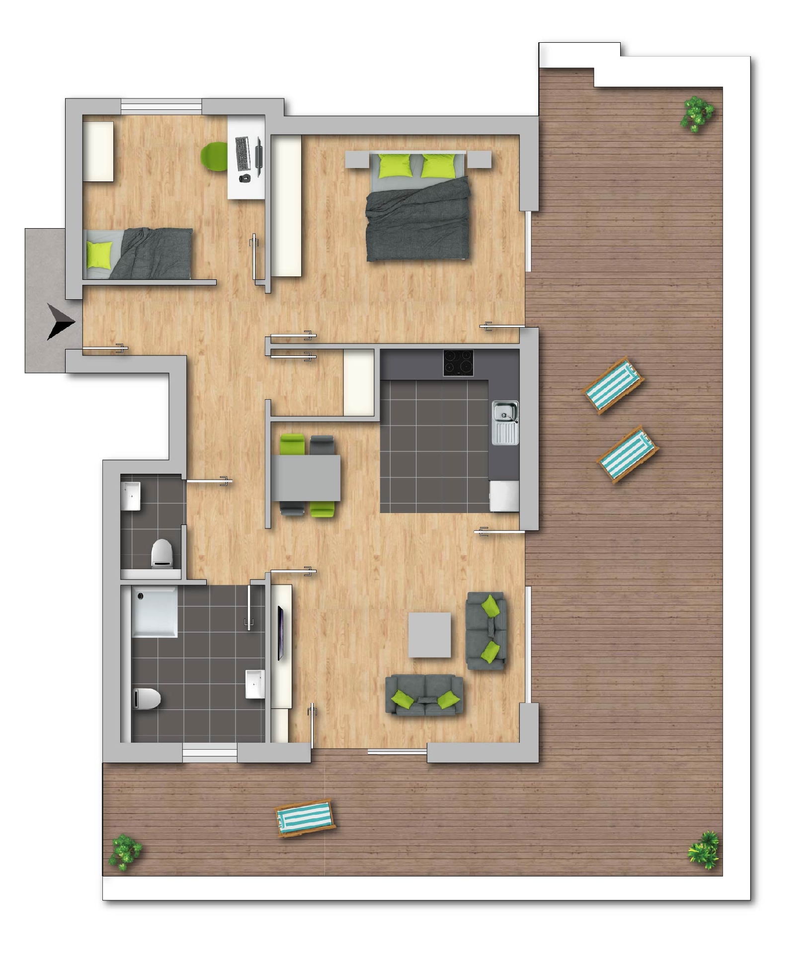 Dreifach verglaste Fenster mit integrierter Raumlüftung Balkon oder Terrasse Vinyl-Design-Böden in den Wohnbereichen Bäder mit Dusche und/oder Badewanne Fußbodenheizung (Luft-Wasser-Wärmepumpe in Kombination mit Gasbrennwerttherme) Warmwasserversorgung über Heizung Gegensprechanlage mit Videokamera Aufzug in alle Ebenen Fahrradkeller Waschkeller mit Anschluss für jede Wohnung Tiefgaragenplätze