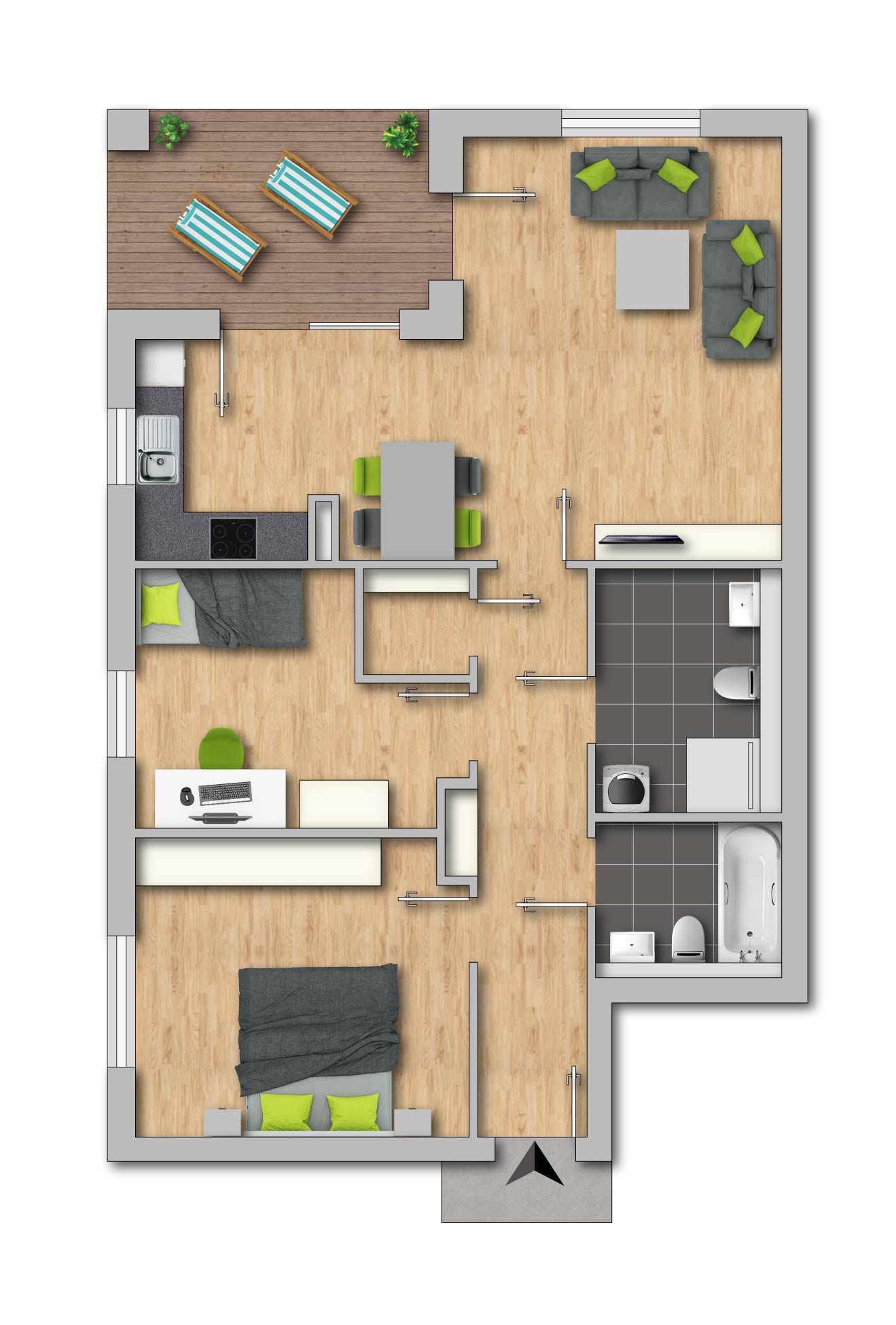Dreifach verglaste Fenster mit integrierter Raumlüftung Balkon oder Terrasse Vinyl-Design-Böden Bäder mit Dusche und/oder Badewanne H e i z u n g nachtragen Aufzug in alle Ebenen Fahrradkeller Waschkeller mit Anschluss für jede Wohnung Tiefgaragenplätze