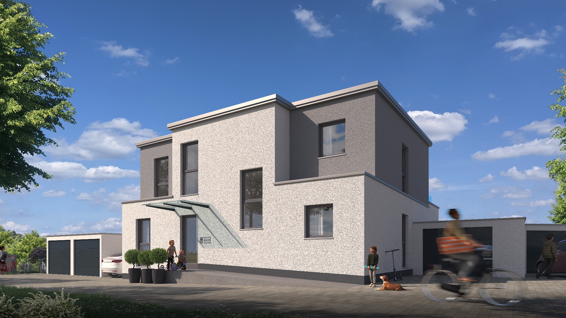 Dieses moderne Haus verfügt über drei Etagen und bietet großzügig Platz für Familien oder auch für individuelle Wohnkonzepte. Das Grundstück bietet einen schönen Außenbereich mit einem traumhaften Weitblick. Das Haus besticht durch seine moderne, aber dennoch zeitlose Architektur. Die Fassade ist in einem eleganten Grauton gehalten und wird durch große Fensterfronten aufgelockert. Sie haben die Möglichkeit, eigene Wünsche und Vorstellungen zu gestalten, sofern die Pläne es gestatten. Die hochwertigen Materialien und die moderne Ausstattung lassen dabei keine Wünsche offen. Auch das Grundstück bietet viel Potential, um sich einen persönlichen Rückzugsort im Freien zu schaffen - entweder auf der großen Terrasse mit Gartenanteil oder auf dem Balkon. Ihr Fahrzeug parken Sie bequem in der Garage oder unter einem Carport.